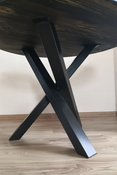 Matētas, melnas metāla kājas 80x60mm, krāsotas ar pulverkrāsojumu un 40mm biezi priedes koka dēļi.